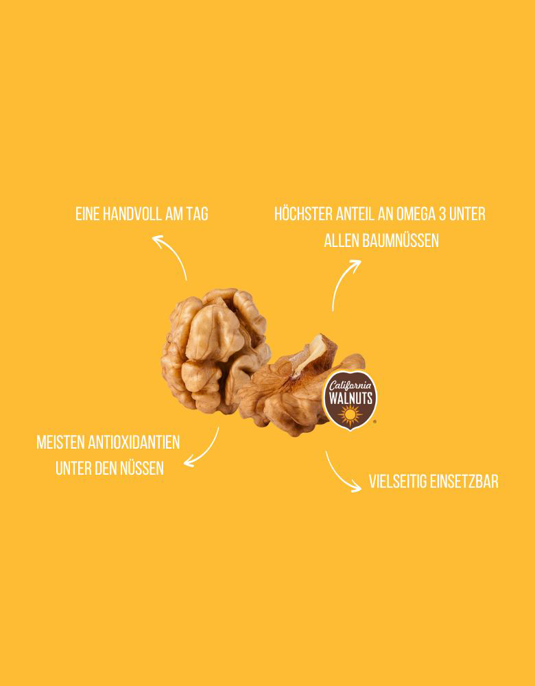 Professor Claire Williams von der University of Reading, die die Studie leitete, sagte: „Diese Studie stärkt die Argumente für Walnüsse als Gehirnnahrung. Eine Handvoll Walnüsse zum Frühstück könnte jungen Erwachsenen einen geistigen Vorteil verschaffen, wenn sie Höchstleistungen erbringen müssen. Es ist besonders spannend, dass eine so einfache Nahrungsergänzung einen messbaren Unterschied in der kognitiven Leistung bewirken kann.“ Die Forscher vermuten, dass der Nährstoffmix der Walnüsse - darunter Omega-3-Alpha-Linolensäure (ALA), Eiweiß und Pflanzenstoffe - die kognitive Leistung verbessern kann. Die Walnuss ist die einzige Nuss, die eine exzellente Quelle für Omega-3-ALA (2,7 g/30 g) bietet, was unter anderem die Gesundheit des Gehirns und des Herzens unterstützt.2 Walnüsse liefern bei einer täglichen Ration von einer Handvoll außerdem 4g pflanzliches Eiweiß und eine Vielzahl anderer Nährstoffe.3