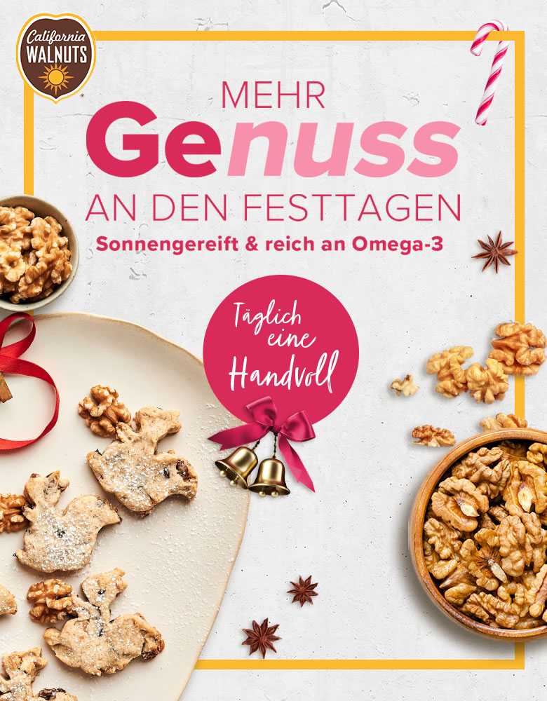 The focus is on inspiring recipe ideas that make everyday enjoyment more appealing – under the motto “More enjoyment every day.” The ads highlight the nutritional benefits of walnuts, such as their omega-3 fatty acid content, and specifically target food-affine audiences: people interested in cooking, healthy eating, vegetarian and vegan lifestyles.